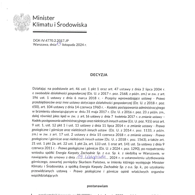 Pobierz istotne dokumenty dotyczące koncesji. Dokumenty stanowią publiczną informację według postanowień Prawa Geologicznego i Górniczego.