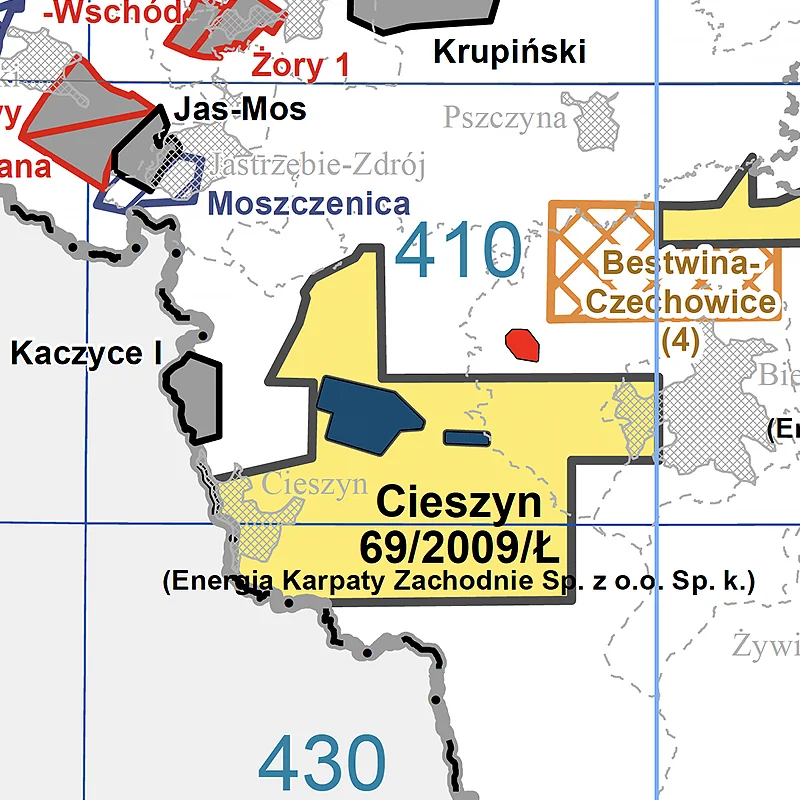 Koncesja Cieszyn (obejmująca część bloków koncesyjnych nr 410 i 430) położona na terenie gmin wiejskich: Brenna, Dębowiec, Goleszów, Hażlach, Jasienica, Jaworze, Pawłowice oraz gmin miejsko-wiejskich: Bielsko-Biała, Cieszyn, Skoczów, Strumień i Ustroń w województwie śląskim.